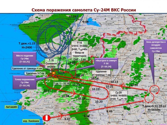 После сближения турецкого истребителя с самолетом Су-24М на расстоянии, равном дальности пуска ракеты - 5-7 км, что свидетельствует о нахождении самолета F-16 над территорией САР, истребитель выполнил резкий маневр вправо со снижением и пропал с экрана индикатора воздушной обстановки.