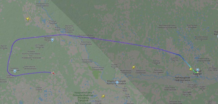 Опубликована траектория полета. Судя по сервису FlightRadar24, лайнер Boeing 737 вылетел из Сургута в Москву, но развернулся и направился обратно в сторону Ханты-Мансийска и Сургута.
