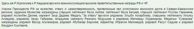 Впрочем, как отмечают некоторые эксперты, Дадаев - распространенная чеченская фамилия, так что награжденный может быть полным тезкой обвиняемого в организации и убийстве Немцова. Точно известно лишь то, что на момент задержания Заур Дадаев служил в батальоне "Север" в Чечне.