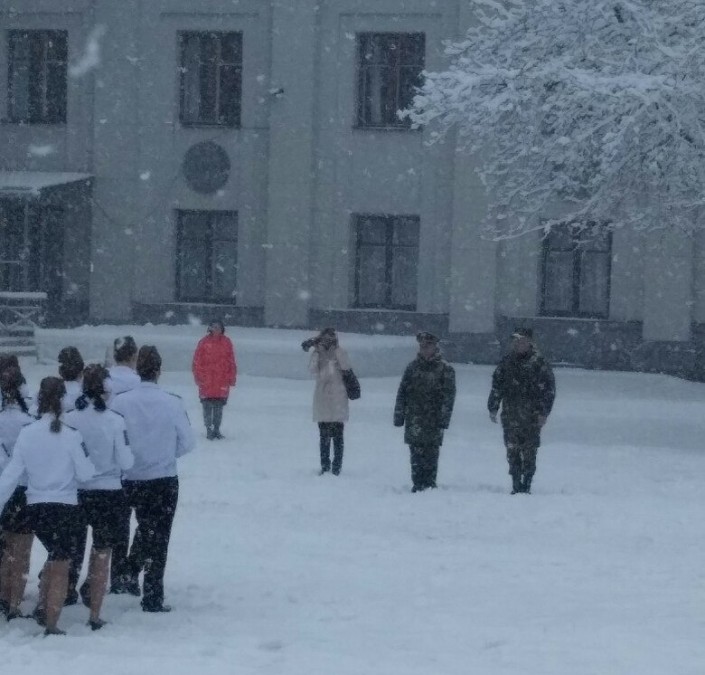 Ранее в соцсетях была опубликована фотография девушек в легкой одежде и обуви, марширующих во время снегопада. Рядом стояли тепло одетые военные и зрители в пуховиках и шапках.