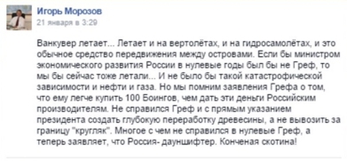 По мнению сенатора, именно Греф, бывший министром экономического развития России в нулевые годы (2000-2007), виновен в том, что страна сейчас находится в полной зависимости от нефти и газа. "Ванкувер летает... Летает и на вертолетах, и на гидросамолетах, и это обычное средство передвижения между островами. Если бы министром экономического развития России в нулевые годы был бы не Греф, то мы бы сейчас тоже летали... И не было бы такой катастрофической зависимости от нефти и газа. Но мы помним заявления Грефа о том, что ему легче купить 100 "Боингов", чем дать эти деньги российским производителям. Не справился Греф и с прямым указанием президента создать глубокую переработку древесины, а не вывозить за границу "кругляк". Многое с чем не справился в нулевые Греф, а теперь заявляет, что Россия - дауншифтер. Безнравственный человек!" - написал Морозов.