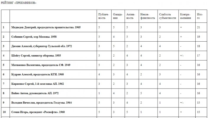 Как уточняет фонд, в список включены персоны, наиболее часто фигурировавшие в раскладах в числе гипотетических "преемников" или наиболее активно претендовавшие на эту роль.