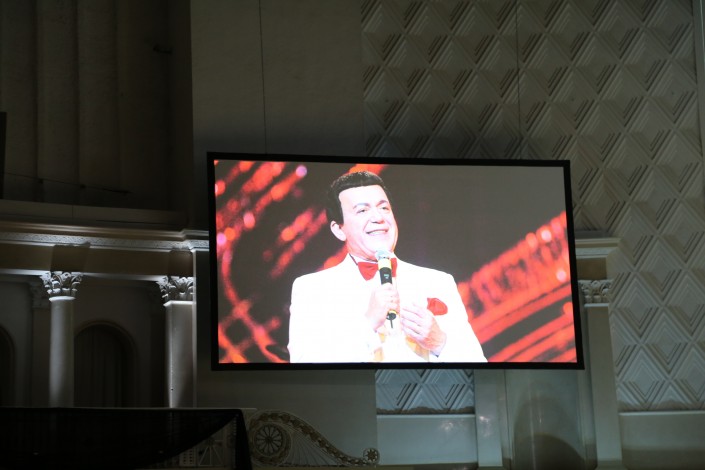 В зале звучит знаменитая мелодия из кинофильма "17 мгновений весны", у гроба, за которым стоят венки, постоянно находится почетный караул, край сцены усыпан цветами. За роялем сидел известный композитор и пианист Левон Оганезов. Он исполнил классические произведения и композиции из репертуара Кобзона. Позднее на экранах, расположенных над сценой, показали архивные кадры с Кобзоном в музыкальном сопровождении его песен.