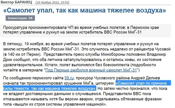 Оказалось, что Джен Псаки такие слова не произносила - это сделал прокурор Чусовского района Пермского края Андрей Делиев совсем по другому поводу. "Самолет упал по причине силы тяжести, так как машина тяжелее воздуха", - так прокомментировал Делиев падение истребителя МиГ-31 в ходе учебных полетов в ноябре 2010 года.