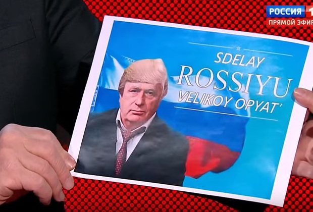 Далее он вынул листок, на котором был изображен он сам с прифотошопленной прической Трампа. Он назвал это народным творчеством. Картинку сопровождала подпись "Сделай Россию великой опять" - по аналогии с предвыборным лозунгом Трампа вернуть былое величие США. По мнению Жириновского, картинка должна была доказать, какого именно президента хочет народ.