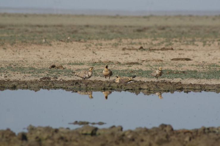 Вместе с розовыми стаями в заповеднике несложно найти редкую гнездящуюся перелетную птицу кречетку (Chettusia gregaria) и два вида жаворонков - черного (Melanocorypha yeltoniensis) и белокрылого (Melanocorypha leucoptera).