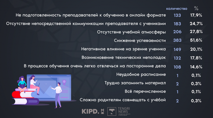 "Как показывают результаты исследования, более половины опрошенных были не удовлетворены онлайн-форматом обучения. 57,4 процента ответили, что не удовлетворены. Это большинство респондентов. Удовлетворенность отметили 26,7 процента, и 16 процентов сказали, что они не сталкивались. То есть были такие респонденты, у кого еще дети маленькие или еще нет детей", - рассказала Аюпова.