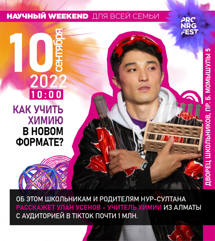 PRO.NRG FEST пройдет в формате образовательного уик-энда 10 сентября 2022 года в столичном Дворце школьников по адресу: проспект Момышулы, 5. Принять участие в фестивале могут все желающие по обязательной предварительной регистрации.