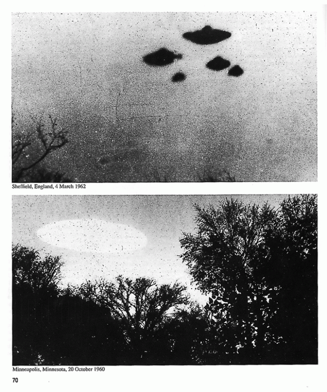 На другом фото, сделанном, как написано британской студенткой Алекс Бич 4 марта 1962 года, запечатлена целая группа НЛО, зависших над городом Шеффилд в Великобритании. Также обнародованы снимки неопознанных объектов, снятых в Миннеаполисе 20 октября 1960 года и Нью-Джерси в июле 1952 года.