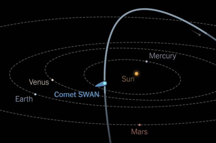 Астрономы рассчитали траекторию полета SWAN, и, по их данным, сейчас космическое тело пролетает в созвездии Рыб и находится от Земли на максимально близком расстоянии - в 84 миллионах километров. Ученые утверждают, что жители южного полушария Земли могут разглядеть "зелено-голубое ядро" и "длинный светящийся зеленоватый хвост" кометы невооруженным взглядом.
