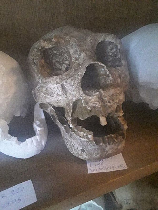 Череп гейдельбергского человека, который жил в Европе 700-345 тысяч лет назад , хранится на кафедре антропологии биологического факультета МГУ им. М. В. Ломоносова