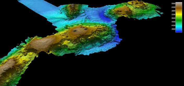 Сканирование показало, что вулканы поднялись с морского дна примерно до уровня 5000 метров ниже поверхности воды. Часть из них имеет заостренные пики, другие, наоборот, представляют собой огромное низкое плато.