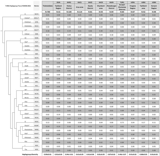 Генофонд популяций региона исследовали по Y-хромосоме, которая в большей степени, чем остальные части генома, отражает разнообразие населения. Как показали авторы, более половины всего Y-хромосомного генофонда Трансоксианы приходится на три гаплогруппы (варианта): С2-М217, R1a1a-M198 и Q-M242. Но генетические портреты популяций своеобразны: С2-М217 составляет две трети генофонда южных казахов; R1a1a-M198 часто встречается у узбеков и дунган; на Q-M242 приходится три четверти генофонда туркмен. Генетические портреты родоплеменных групп еще более своеобразны: С2-М217 составляет 88 процентов в казахском племени Конырат, С2b1a2-М48 - 75 процентов у казахского клана Алимулы, Q-M242 -71 процентов в туркменском племени Йомуд.