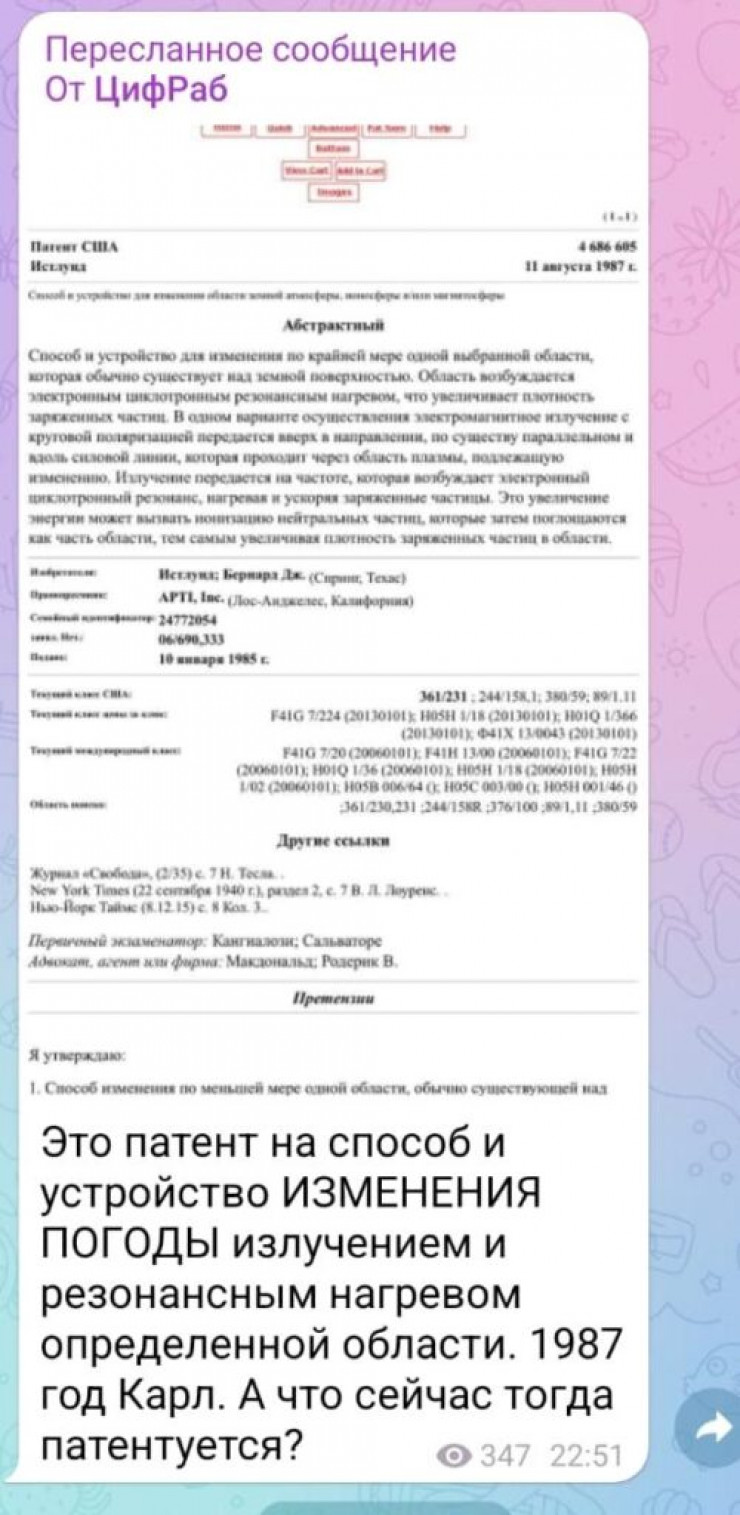 Пользователи Сети обнаружили патент, якобы описывающий технологию изменения погоды методом резонансного нагрева определенной области. Некоторые предполагают, что раз такие технологии существовали еще в 1987 году, то сейчас наверняка есть устройства, позволяющие контролировать климат на огромных территориях. Почему это не так, объяснили в StopFake, передает Tengrinews.kz.
