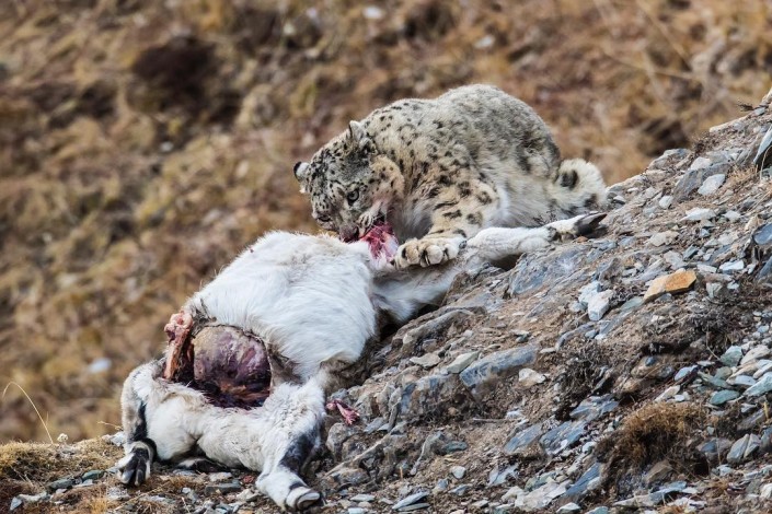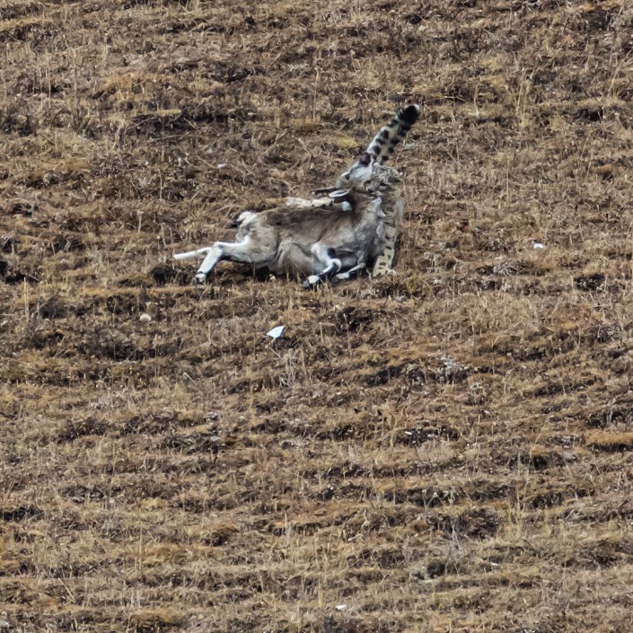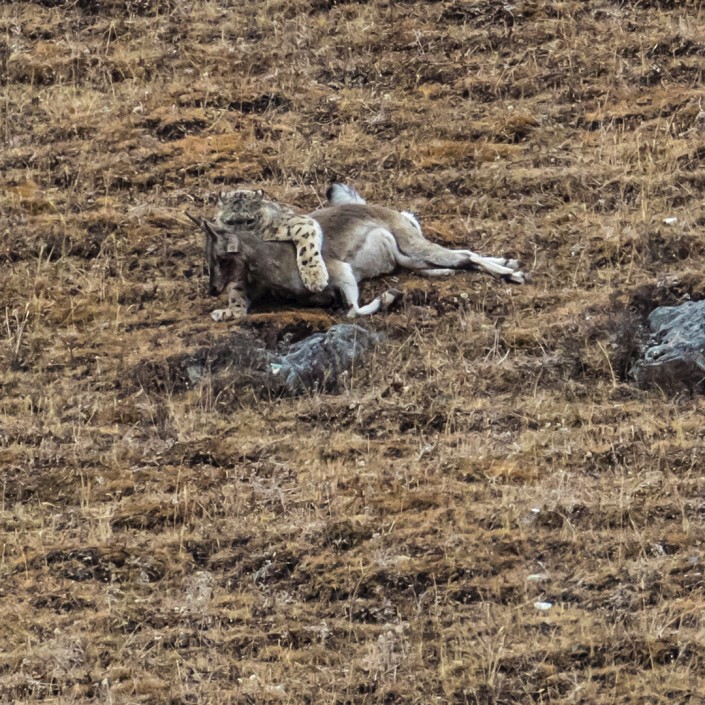 После длительного ожидания фотосессия все же состоялась. При этом снежный барс продемонстрировал свое охотничье мастерство: он не сразу напал на выбранную жертву, а сначала столкнул ее со склона. Баран, проделавший головокружительный путь вниз, оказался дезориентирован и ослаблен, и это сильно облегчило задачу нападавшему.