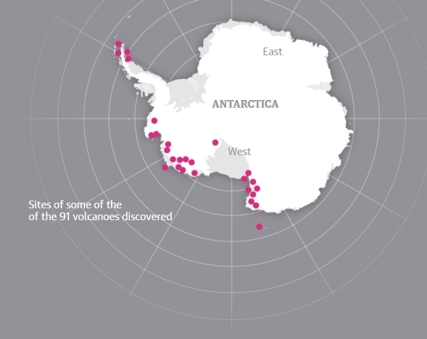 Ученые из Эдинбургского университета обнаружили подо льдами Антарктиды новый крупнейший вулканический регион на планете - 91 ранее неизвестный вулкан. Все они имеют высоту от 100 до 3850 метров, сообщает National Geographic.
