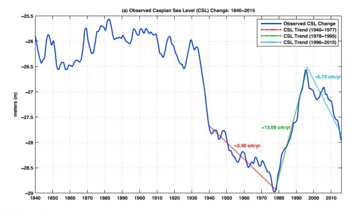 Наблюдения за состоянием озера ведутся с середины XIX века. За это время уровень воды несколько раз заметно колебался. Однако в последние десятилетия колебания уровня воды стали более резкими. © Geophysical Research Letters