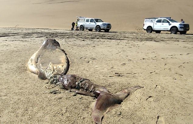 На пляж побережья Намибии выбросило шестиметровое тело загадочного морского обитателя. Существо уже подверглось разложению, поэтому специалисты сразу затруднились определить его точную видовую принадлежность, пишет "Моя планета".