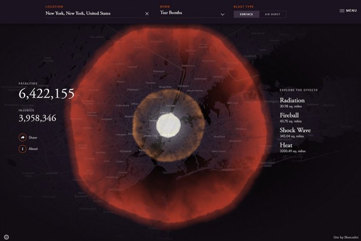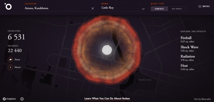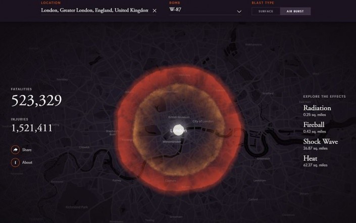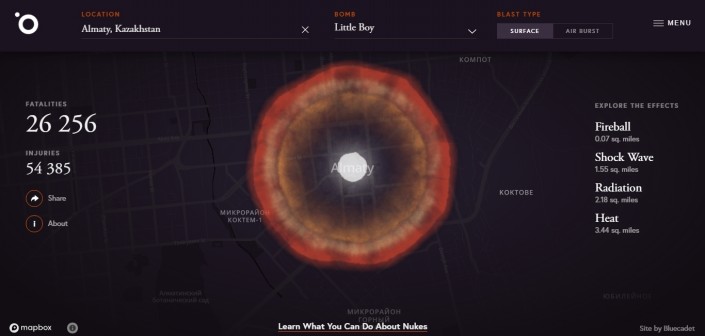 На карте необходимо ввести название населенного пункта, выбрать разновидность ядерной бомбы ("Малыш" мощностью 15 килотонн, северокорейская "Хвасон-14" мощностью 150 килотонн, американский термоядерный заряд W87 мощностью 300 килотонн или советская "Царь-бомба", мощность взрыва которой оценивается в 50 мегатонн) и место детонации - на земле или в атмосфере.