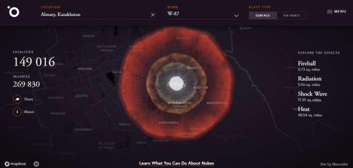 В зависимости от выбранных параметров симулятор покажет, сколько человек погибнет и получит ранения при взрыве в заданной точке мира. Также алгоритм рассчитает, на какую площадь распространятся радиация, ударная волна и тепловое излучение.