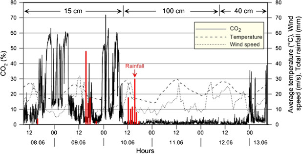 Зависимость концентрации углекислого газа у входа в грот от времени суток и погоды. По оси Х отложены часы, по оси Y (слева) - концентрация углекислого газа, по оси Y (справа) - средняя температура, скорость ветра и количество осадков. © Archaeological and Anthropological Science