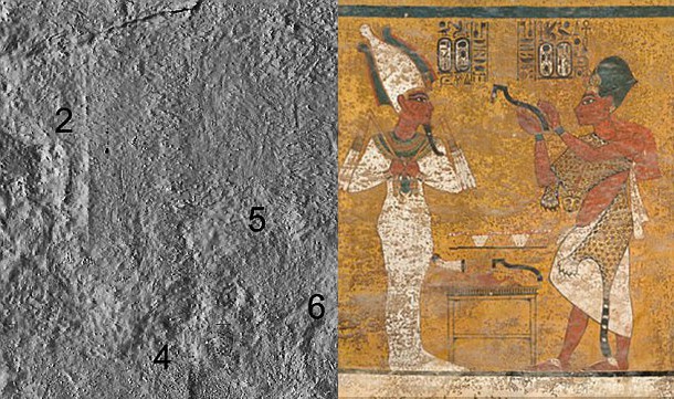 Ученый рассказал, что следы двух потайных порталов нашел, подробно изучая трехмерные снимки гробницы Тутанхамона, сделанные в 2014 году. Дверные проемы не замечали целое столетие из-за того, что стена покрыта фреской, поясняет археолог.
