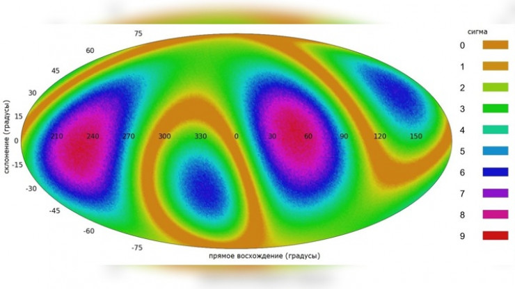 Но дело не только в том, что тех и других разное количество. Они еще и сложным образом распределены по небу. Согласно расчетам эксперта, это распределение имеет квадрупольную (четырехполюсную) структуру.