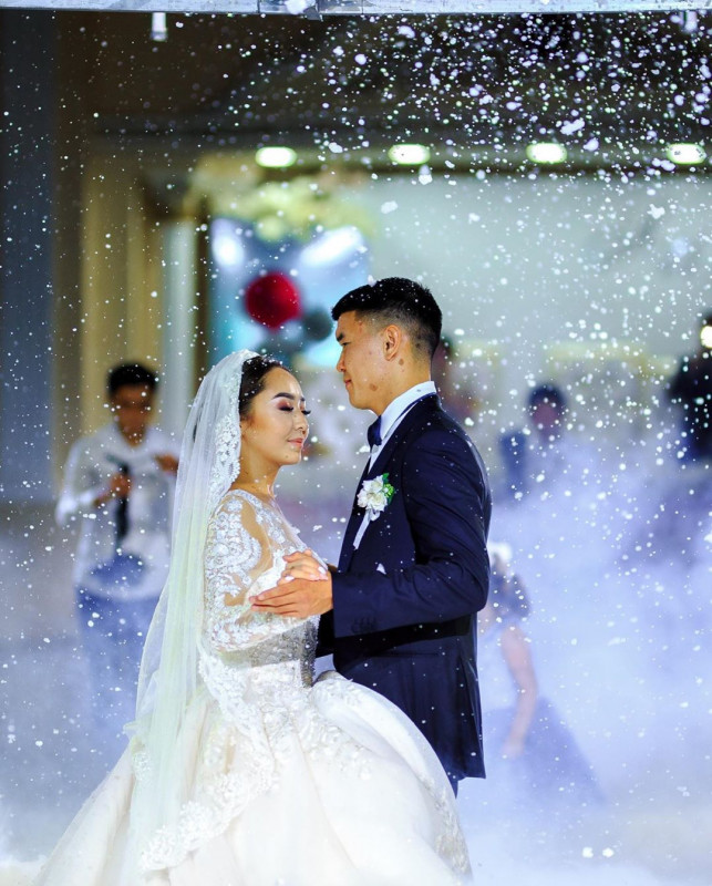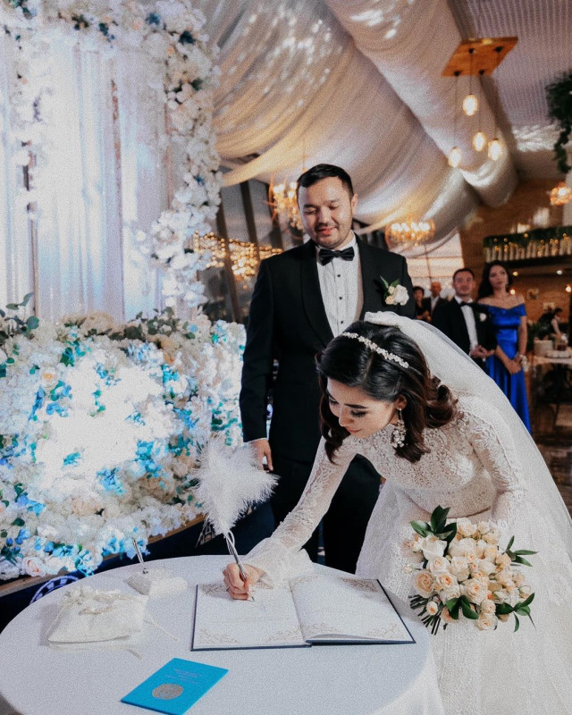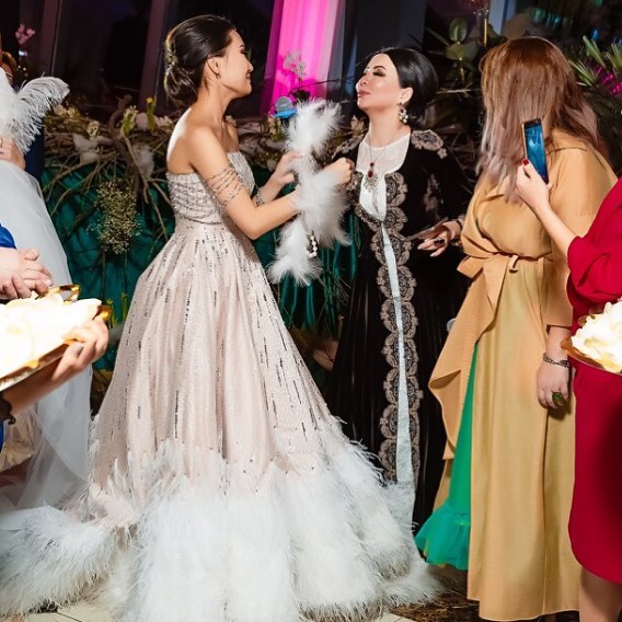 Қонақтар арасында Мақпал Исабекова, Анар Батырхан, Әсел Сәдуақасова, Жәния Джуринская және басқалар болды. Қалыңдықтың үйлену букетін актриса Сая Оразғалиева ұстап алды.
