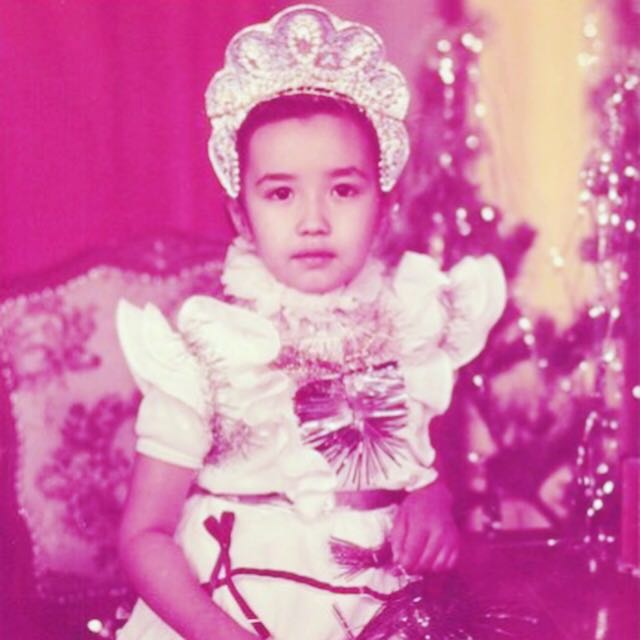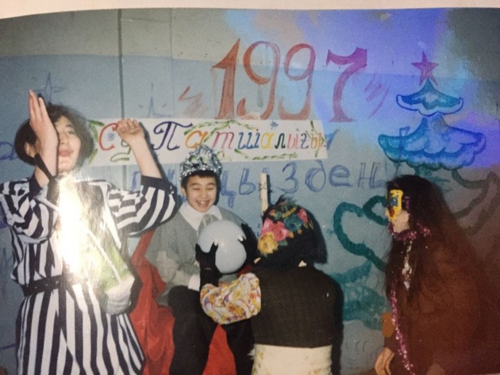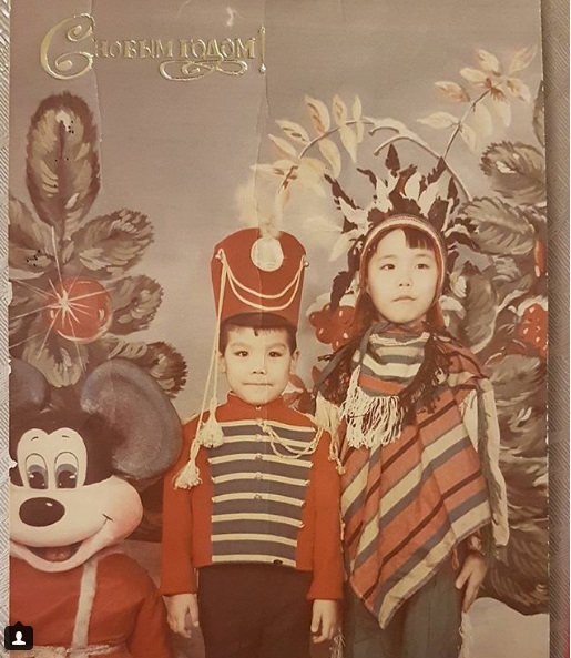 "Это был пятый класс. Я училась в школе № 44 в Усть-Каменогорске. Наша учительница любила спектакли, и на Новый год она решила поставить очередную пьесу, в которой участвовали я и моя подружка Зарина. Мне досталась роль морской ведьмы, а подруге - бабы Яги. На мне было старое платье моей мамы коричневого цвета, на лице была желтая маска, а волосы я распустила.  Честно говоря, сценарий я не помню, но помню, что всем понравилось. Кто-то нас узнавал, а кто-то нет, кто-то смеялся. До сих пор смотрим фото и смеемся", - вспоминает актриса.