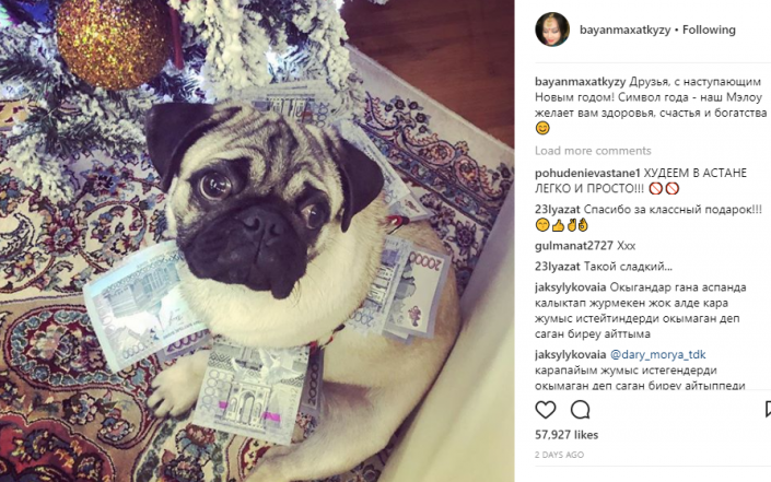 В Instagram продюсера Баян Алагузовой также появились праздничные фотографии. Одна из них с домашним питомцем - собакой по кличке Мэлоу, обмотанной денежными купюрами.