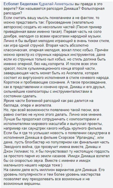 Бастапқыда Есболат Беделхан Facebook желісіндегі парақшасында Димаштың басқа елдердегі концерттерінде бекер домбыра шертетінін айтқан. Алайда пікір жазғандар одан ойын толығырақ жазуын өтінген.