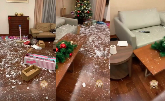 На видео показаны упавшая елка, разбросанный по всему помещению искусственный снег, поломанные вещи, коробки, а на журнальном столе оказался рулон туалетной бумаги.