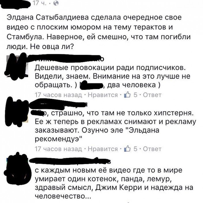 По словам Эльданы, она не думала, что "видос воспримут так отрицательно". "Не буду ничего говорить в свое оправдание, вначале, конечно, я сама возмутилась типа: "Я же детей не насилую, щенков не режу. Что плохого я сделала?" А потом поняла, что, скорее всего, реально перегнула палку (у меня частенько такое бывает). Наверное, в силу моей недалекости и странного чувства юмора, мне эта идея для видео показалась смешной. У людей горе, а я, сволочь, как всегда стебу всех. Я тут хотела извиниться перед жителями Турции, но поняла, что они даже меня не фолловят, и им вообще по барабану на мой профиль. Ну так вот, ребята, извинюсь перед вами, перед всеми, кого это видео задело, и перед мамами, чьих детей я, возможно, порчу. Я говорю это без сарказма, просто серьезно я получаю столько отзывов именно от мам, типа подаю плохой пример. Я делаю это не специально, просто такой вот я человек", - написала она.