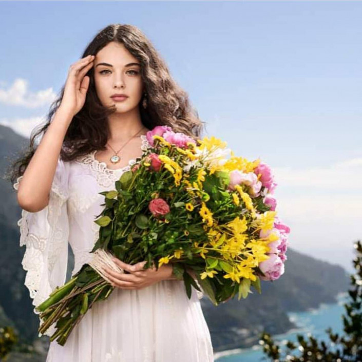 На фото Дева позирует в белоснежном кружевном платье на фоне Амальфийского побережья.