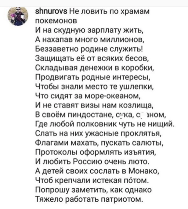 В своем опусе певец иронично прокомментировал недавние скандалы с задержанием блогера за ловлю покемонов в храме, обыск в квартире полковника Дмитрия Захарченко, а также жестко охарактеризовал выдающих себя за российских патриотов чиновников.