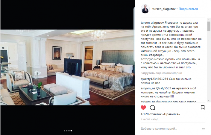 "Я совсем не держу зла на тебя Арсен, хочу чтобы ты знал про это и не думал по другому, надеюсь придет время и ты осознаешь свой поступок , как бы ты его не переживал на тот момент, я все равно буду любить и помогать тебе в какой бы ты не оказался жизненной ситуации, ведь это всего лишь квартира, которую можно купить или обменять, а с совестью и честью так не поступить, хочу что бы ты помнил и знал это", - написал в посте Алагузов (орфография и пунктуация автора в основном сохранены - прим.).
