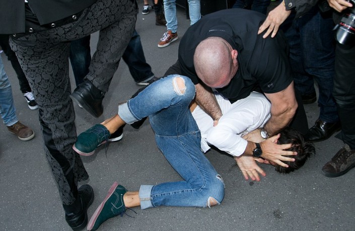 Когда Кардашьян вышла из автомобиля, Седюк подбежал к ней и поцеловал в "пятую точку". Все происходило в окружении журналистов и толпы зевак. Охранники среагировали быстро. Они оттащили хулигана от знаменитости, повалили на землю, а затем вывели за ограждение.