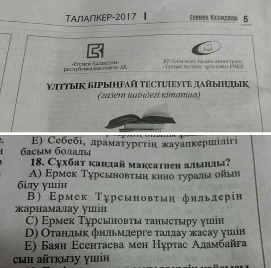Задания Единого национального тестирования были опубликовали в республиканской газете. В одном из них авторы использовали интервью казахстанского режиссера Ермека Турсунова. Речь в нем шла о Есентаевой и Адамбаеве. А к интервью прилагались вопросы.