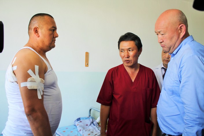 Вице-премьер Кыргызстана Жениш Разаков с ранеными в конфликте