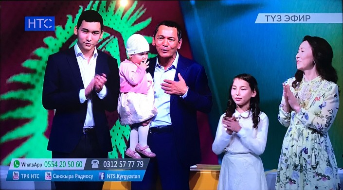 В конце выступления в студии появились жена Рита, дочери Ария и Айлин и сын Нурэмир. Старшая дочь Айпери, как отметил кандидат, сейчас учится в высшем учебном заведении (в Англии - по данным издания Спутник Кыргызстан) и не может присутствовать рядом.
