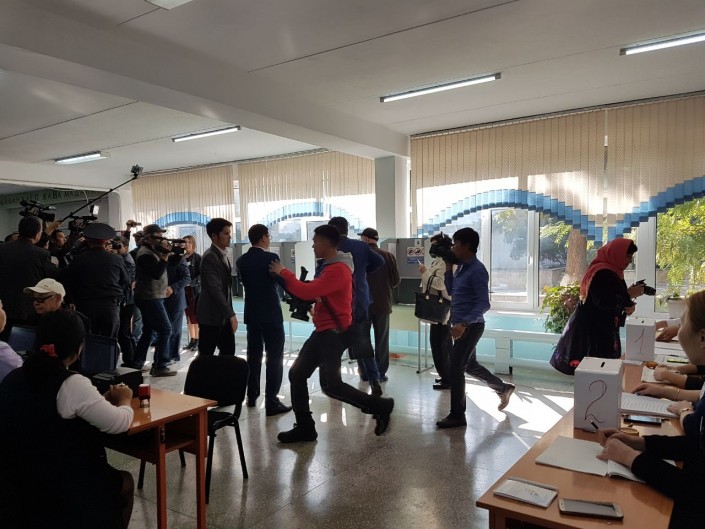 Сооронбай Жээнбеков пришел голосовать со своими коллегами из штаба. Когда он подошел к избирательной комиссии, журналистам запретили фотографировать бюллетень и попросили не подходить близко к кандидату.