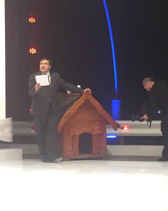 "Вероятно, появление такой декорации в студии обусловлено недавними высказываниями президента страны Петра Порошенко, который во время посещения Харьковского тракторного завода в начале марта заявил, что "люди, которые и будки собачьей не построили", пытаются дестабилизировать ситуацию в стране", - отмечает РИА Новости.