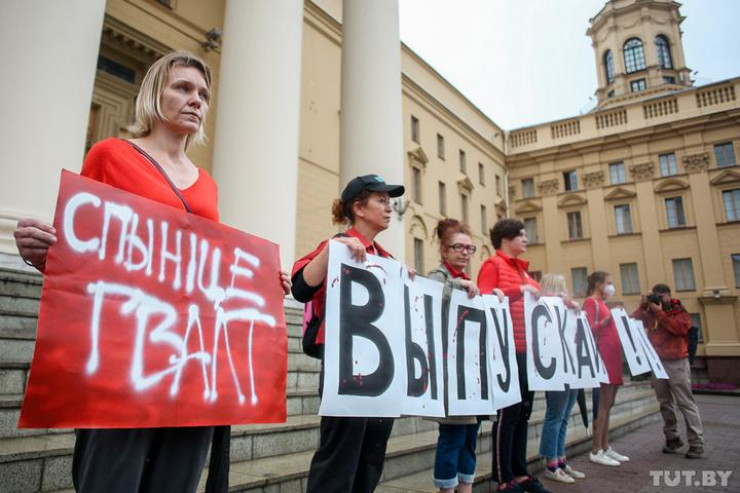 На ступеньки у здания КГБ в Минске поднялись шесть женщин. Вместе они держали буквы, складывающиеся в слово "Выпускай", и плакат "Спынiце гвалт". Позже к ним присоединилась еще одна женщина в платке.