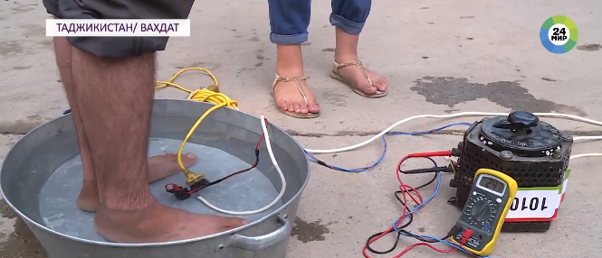 Голыми ногами в железный таз Сайфулло Олимов встает без всякого страха, закидывает электрическую переноску и с помощью лабораторного автотрансформатора поднимает напряжение. Чтобы доказать прозрачность эксперимента, к переноске подключает тестер, который демонстрирует уровень напряжения. Прибор показывает 246 вольт, вода кипит, если в нее опустить палец, человек может скончаться на месте.