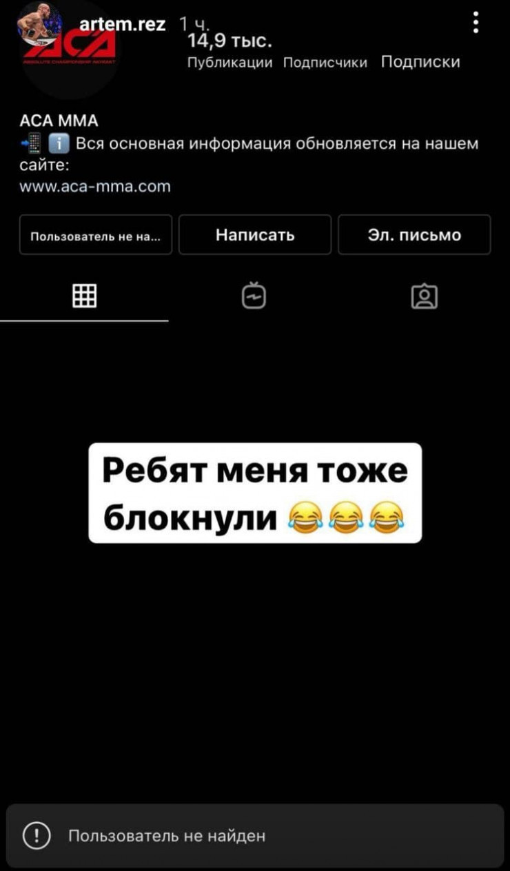Известный казахстанский боец Артем Резников сообщил, что базирующаяся в Грозном лига Absolute Championship Akhmat (ACA) заблокировала его в социальной сети, сообщает Tengrinews.kz со ссылкой на Vesti.kz.