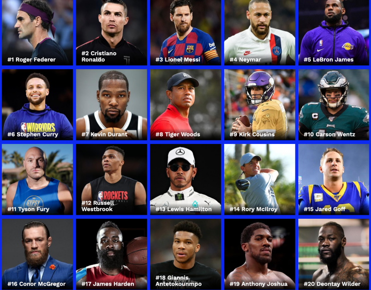 Следующий в списке футболист - Неймар, замыкает пятерку звезда NBA Джеймс Леброн.