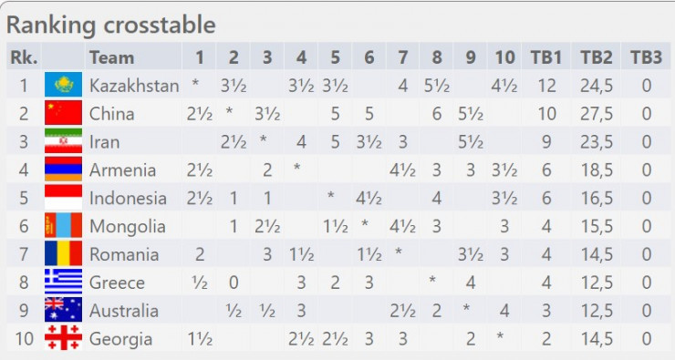 А в шестом туре сборная Казахстана разгромила Грецию - 5,5-0,5. Победы на счету Рустама Хуснутдинова, Абдумалик, Гулисхан Нахбаевой, Казыбек Ногербек и Асаубаевой.