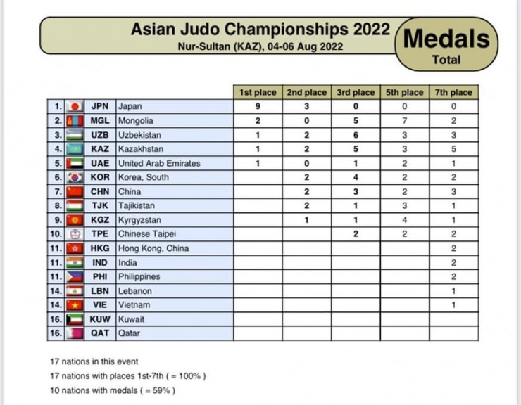 Казахстан занял четвертое место в медальном зачете чемпионата Азии-2022 по дзюдо в Нур-Султане, сообщают Vesti.kz, передает Tengrinews.kz.