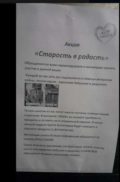 Девушка отмечает, что акцию активно поддержали. "Сейчас попросила разместить информацию об акции в популярных аккаунтах в соцсетях. Отозвался магазин в другом ЖК, они также не против, чтобы эта акция проходила и у них. В эту субботу мы первый раз выезжали. Кому-то из бабушек, дедушек помогли убраться, посуду, полы помыли, постель забрали, постирали. В некоторых случаях в магазин некому сходить у бабушек, дедушек. Некоторым просто общения не хватает. На 8 Марта хотим организовать небольшой концерт", - рассказывает Айдана.