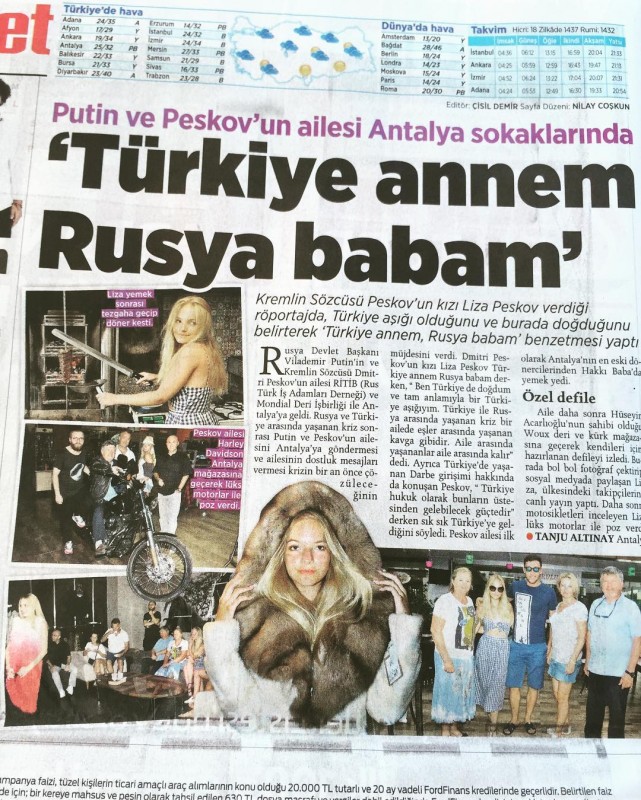 18-летняя дочь пресс-секретаря президента России Дмитрия Пескова Лиза оказалась на первых полосах турецких газет. Фотографии обложек турецких газет опубликовала у себя в Instagram мама Лизы - бывшая жена Пескова Екатерина.